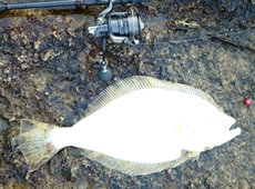 その後、少しポイントを移動。 移動後、磯場にカタクチイワシ打ち上げられホットな状況! リグをジグヘッド21gにワームはダイワ・フラットジャンキーダックフィンシャッド3.5インチをチョイス。 ベイトフィッシュを意識しスイミングアクションで狙うと中層でヒットに! ファイトがかなり強烈で良型と確信。 浮かせるのも一苦労で、何とかキャッチしたのは43.5cmのナイスサイズのマゾイ! クロソイ&マゾイの40アップに50アップのヒラメと大満足の釣果となりした!