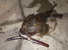 バークレイ・イール8インチに1.8 gシンカーを装着したネコリグをセット。ボトムをゆっくりとアクションし、時折シェイクやステイをしながらじっくりと狙います。しばらくするとシェイク中に「コッ」と明確なバイトがありヒット!ズッシリ重量感の正体は本命のカジカ!