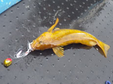 恵山沖へにロックフィッシュを狙いに行ってきました!今回はタイラバをメインに狙ってみました。水深30mのポイントへ到着。カルティバ・サクラドロップ60gをセット。着底後、ゆっくりとスローリトリーブしある程度巻き上げた所で再びボトムと繰り返していると、さっそく「ゴツゴツ」とバイト!ヒットしたのはガヤ(エゾメバル)。その後もガヤの猛攻!あまり多さにポイントを移動。