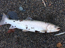 ジャーク&フォールで狙っている多くのアングラーに反応が無いことから、アクションをスローなタダ巻きにシフトとし狙ってみると沖目で待望のヒット!青物?と思ってしまうほど、ドラグが出される強いファイト!慎重にやり取りしランディングしたのは62cmのアメマス!厳しい状況に諦めかけていた中で、貴重な1匹を手にすることができました。