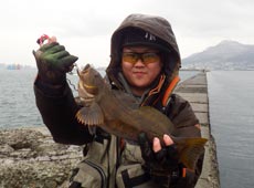 近間さんにヒットしたのは小型のマゾイ(笑)写真は冗談ですが、40アップを筆頭に多くのアブラコ(アイナメ)をキャッチしていました!
