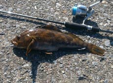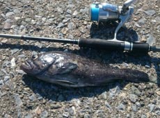シンカーを切らし残っていたのは28gのみ。5 lb で28gのアンバランスな設定で再開。着底後のファーストアクションで「ゴン」と今日一番の反応。あわせると強烈な首振り。楽しませてくれたのは体高のあるグッドコンディションの41cmのアブラコ(アイナメ)。同行者にタモ入れしてもらい何とかキャッチできました ( 汗 )