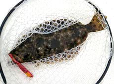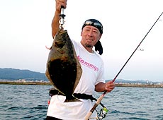 再び同じポイントを狙うと、次は三浦さんがヒット! 激しい突っ込みに耐えてキャッチしたのはサイズアップとなる55cmのヒラメ! ヒットルアーはバークレイ・パルスワーム4インチ。 朝の部はこの1匹で終了。