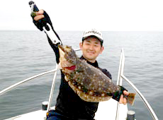 同日夕方、次は少佐とチャレンジ! 風が強くかなり釣りにくい状況でしたが、巧みにルアーを操作し、うまくボトムをキープしていた少佐にヒット! ワクワクしながら寄せてくると、良型のヒラメの姿! キャッチしたのは55アップのナイスサイズ! この1匹で夕方の釣行は終了。 ヒラメのボートゲームハマりそうです!