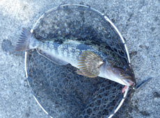 時合を待ってキャストを繰り返していると、曇り空から日が差し始めたためか魚の活性が良くなってきました! アクションをリフト&フォールにチェンジ。リグをアピールさせると、リフト中に「ゴンッ」と強烈なバイトがありヒット! ヘビークラスのロッドを気持ち良く曲げてくれたのは40アップのナイスサイズのアブラコ(アイナメ)!