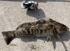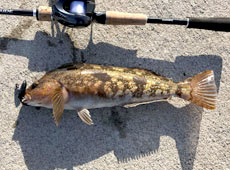 ジャングルジム・ビーンズを使ったビフテキ14gにベイトブレス・フィッシュテール3.3インチを合わせてリフト&フォール、小さくリフト&フォールから大きくリフト&フォールと誘い方を変えながら誘うとアブラコ(アイナメ)がヒット!