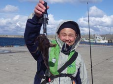 それからは反応が無くポイントを移動し、次はカジカ狙い。ビッグワームのネコリグで狙ってみました。5 g ネイルシンカーにワームはエバーグリーン・スパインカーリー10,5インチをチョイス。ボトムでゆっくりとワームをアクションさせると「コッ!」と明確なバイトを感じヒット!ズッシリと特有の重量感で上がってきたのは30 cm ほどのカジカでした。