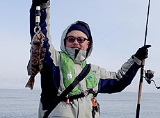 まずはサーフからスタート!ビフテキに4インチのホッグ系ワームと強気セッティングで攻めていた文彦さんに幸先よくアブラコ(アイナメ)がヒット!