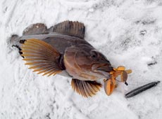 ワームをエコギア熟成アクア・リングマックス3.8インチに変えて駆け上がりを早いボトムバンプで探ってくるとアブラコ(アイナメ)がヒット!