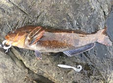 1キャスト目からフォール中に強烈なバイト!しかしフッキングまで至らず・・・次のキャストのリフト&フォール中に再びバイト!40アップのアブラコ(アイナメ)をゲット!ヒットルアーはサワムラ・ワンナップカーリー5インチ