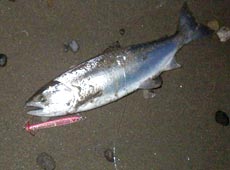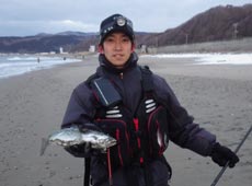 隣でキャストを繰り返していた小野くんにもヒット!今季初サクラをキャッチ!ヒットルアーはサミーズ・サーフトリップ30