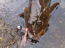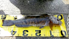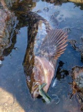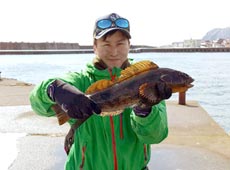 まずは磯に入釣。沖の根周りをフジワラ・ブラスボール18gとエコギア・バグアンツ3インチを組み合わせたテキサスリグを使い、魚の反応を探してひたすらキャストを繰り返し、45cmのアブラコ(アイナメ)がヒットしました。 さらに40アップをもう一本追加し、反応がなくなったところで場所を磯から漁港へ