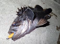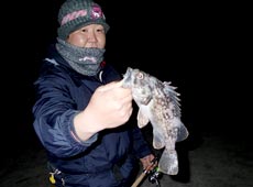 1.5gのジグヘッドにエコギア・ミノーMを合わせて、足元のケーソンの上を低空飛行のリフト&フォールでハチガラ(オウゴンムラソイ)がヒット!