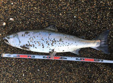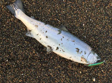 ルアーをミノーに変えてキャスティング!巻いてからのストップに「もふっ」と鈍いあたり!フッキングするとグイグイと首を振る感じで重たい感触!手前まで寄せて、打ち寄せる波と一緒にランディング!と思いきや、一気に手前に走り、勢い余って砂浜まで勝手に泳いでランディング成功(笑)63cm、3.2kgのスーパーサクラマス!今季初60アップゲットでした!