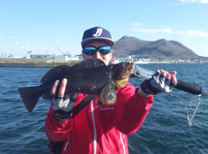 久々の沖提釣行のFさん も沖目のカケ上がり付近をゆっくりとスイミングで狙いクロソイゲット!