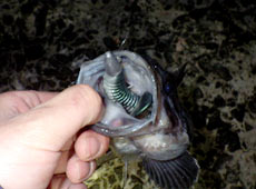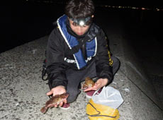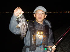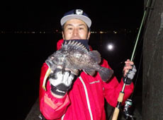 前日の雨の影響か?濁りが入り、魚の活性は低い状況。そんな中、最初にヒットしたのは近間さん!沈みブロックの穴打ちでアブラコ(アイナメ)ゲット!ヒットルアーはエコギア・バグアンツ2インチ。