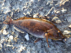 私も後に続こうと7gテキサスリグにバークレイ・ガルプミノー3インチの組み合わせでボトムをゆっくりとズル引きするとヒット!アブラコ(アイナメ)とはファイトが違いズッシリと重量感。正体は30cmを超えるマコガレイ。