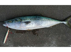 今季初物を狙いに行ってきました! カルティバ・撃投ジグをキャスト!スキッピングで水面上を5回ほどバチャバチャやってから、ジグのフォールさせてジャークで狙うと、魚がジャレついている感触があり、ちょい止めからのジャークでガツンとフッキング!初物のため、いつになく慎重に楽しませていただきました!