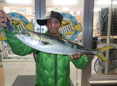 サクラマスを狙いに木古内方面へ。 夜明けとともに釣りをスタート。ルアーは岡クラフトAT-30をセット。キャスト後、リフト&&フォールで狙います。キャストすること4投目、リフト&フォールのフォール中にヒット!ファイトの感じから青物と確信。ドラグを勢い良く出していく青物のファイトにドキドキしながらランディング!キャッチしたのは65cmのフクラギサイズのブリでした!