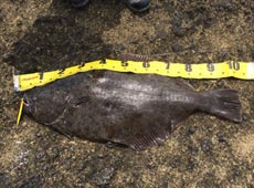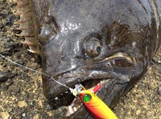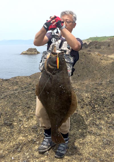 青物を狙いに江差方面の磯へ入釣。 80gのメタルジグを使用し、激しくジャークさせて狙っていると、魚がヒットした感触が手に伝わった瞬間、とてつもない重量感に襲われました。 昨年、同じ場所で釣り上げた95cmのブリよりも重量感があり、ひたすら重くまったく浮いてこない状況。 手前まで寄せると今度は磯にラインが擦れて切れる危険性があり、移動しながら魚を誘導し回避。 何とか浮かせてくると、姿を現したのは今までに見たことのないサイズのヒラメ。 タモ入れしようにも魚が大きすぎて入らず、なんとか魚を足場の低い所まで誘導、同行者にエラに手をかけて磯にズリ上げてランディング。