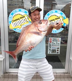 ロック&フラット狙いで日本海の漁港へ!そこで大事件が起きてしまいました! 外堤防のテトラの上から外海に向かって21gテキサスリグ+バークレイ・パルスワーム3.8インチを遠投!着底してからただ巻きのスイミングにガッチリ食いついた瞬間からドラグが出っぱなし!青物でもかかったのか?と思い、慎重にファイトして手前まで寄せてくるとテトラの影から浮き上がった魚体を見てビックリ!「赤い!!!」と叫んでしましました!友人にランディングしてもらい無事キャッチ!61cm、3.9kgの立派なマダイでした。時々釣れるとは聞いていましたが、まさかこんな大きなサイズが釣れるとは驚きでした!