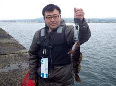 前日の雨の影響で濁りが心配されましたが思いのほか降らず、水質も良く釣れそうな状況。 ファーストヒットは広之さん。ヘチ際のスイミングでアブラコ(アイナメ)ゲット!
