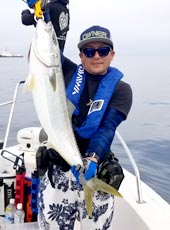 マダイの登場に皆テンションアップ!再びキャストを繰り返すと、今度は竹内さんのタイラバにヒット! ヒット後の重量感、ファイトを見ると相手は青物の様子。ライトジギングロットがきれいに曲がり時折ドラグが勢いよく出ていきます!5分ほどの格闘の後、魚が弱った瞬間に一気にネットイン!キャッチしたのは86cm、5.8kgのブリ! ヒラメはゲットできませんでしたが、締めくくりの一匹となりました!