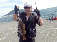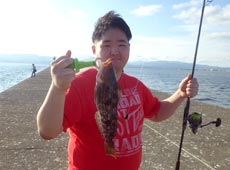 午後2時、函館沖堤(島堤)へ渡船。 ファーストヒットはロックフィッシュを狙っていた五十嵐君。40cmほどのアブラコ(アイナメ)ゲット!