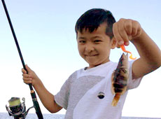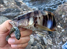 到着翌朝早速釣り場に向かいます。日中は風が強くなる予報なので、朝マズメに神経を集中させて、挑みます。 21g FUJIWARA・ブラスボールにベイトブレス・ペタンコスリムでリフトフォールを繰り返します。すると、つつくようなバイト。十分食い込ませてフッキング。 未開の地でのファーストフィッシュ!水面まで気が抜けません。 ハタみたいなのが釣れました。 息子にもヒット。 その後は風が強く吹いて終了となりました。