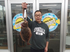 チャンスが来るのを期待しながらキャストを繰り返していると、フォール中に「コツン」とショートバイトがあり、そのままアクションをし続けていると、リフト中に今「ドスン」と重量感のあるバイトに変わりヒット!キャッチしたのは本命のヒラメ!リベンジ成功!!ヒットルアーはエコギア・バルト3 . 5インチ。