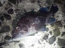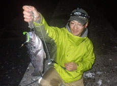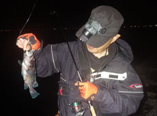 まずは暗くなるまでアブラコ ( アイナメ ) 狙い。風が強く食いも渋い状況の中、近江さんがアブラコ ( アイナメ ) をヒット!