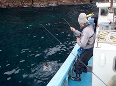船長が指を指しながら「あの辺いいど〜」とアドバイス!それを聞いて葛西さんが的確にキャスト!