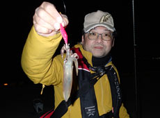 だいもんさんにヤリイカ、さらに立て続けにマメイカもヒット!1.8号ピンク系の夜光タイプのエギにヒット!