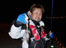 駆けつけた時には2杯目もゲットし、さらに合流してからも先にヒットしたのはあっきーさん! ボトムでしか反応がなく、エギは小さめ、夜光が良い感じとのこと。