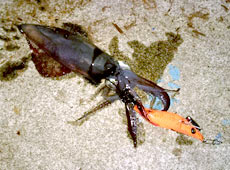 その隣でキャストした自分にもヒット!今回はミミイカじゃなくて、ちゃんとマメイカが釣れましたよ(笑) 前回の釣行のミミイカはこちら