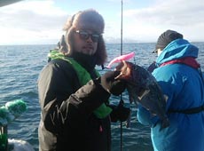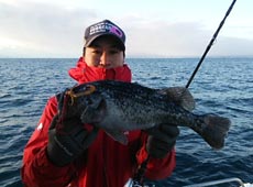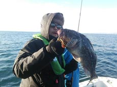 同じくタイラバ初挑戦の近間さんにヒット!こちらもナイスサイズの40 cm ほどのクロソイ。ヒットルアーはアブガルシア・カチカチ玉100 g +エコギア・タイラバアクアカーリー95。初挑戦の2人はタイラバにハマってしまった様子。