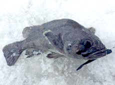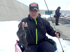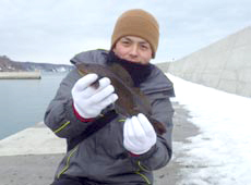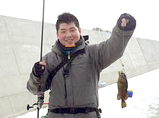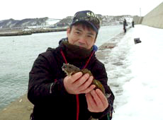 中村さんもナイスサイズのアブラコ ( アイナメ ) ゲット!コツコツと穴打ちをやり続け待望のヒット!良型ゲットにナイススマイル!