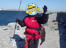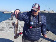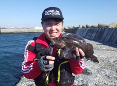 沖堤初参加のひろゆきさんは、なれない沖堤に苦戦しながらもアブラコ ( アイナメ ) キャッチ!