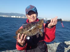 松井さんもナイスサイズのアブラコ ( アイナメ ) ゲット!抜き上げの際にフックアウトし間一髪!