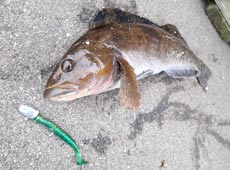 場所を移動しての1投目、エコギア・イワシヘッド+エコギア・グラスミノーLでスイミングさせるとアブラコ(アイナメ)がヒット!