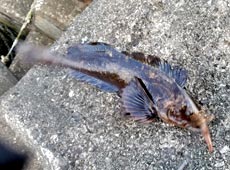 下海岸側の磯場でアブラコ(アイナメ)を狙いました。 強烈な横風とバッドコンディションの中、釣り開始。 36gスティックシンカーのフリリグにワームはエコギア・ロックマックス5インチをセット。 沖に点在する岩礁めがけてキャスト。岩礁際をフリーフォールで狙うと、フォール中にバイト!ファーストキャッチは40アップのアブラコ(アイナメ)!