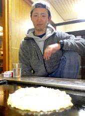 立ち膝で構えるお好み奉行上野様が美味しく焼いてくれました(笑)