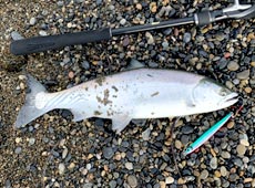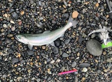 一通り楽しんだ所で江差方面のサーフへ移動。 移動したポイントでもサクラマスの回遊があり、数投目であっさりキャッチ! 2匹釣り上げた所で満足し終了。