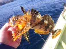 私にもカジカがヒット!しかも今まで見たことがない種類のカジカ!厳つい背ビレに派手な模様。背中に一列に並んだウロコにエラまわりのトゲが!調べたところ正体は"ヨコスジカジカ"。私はカッコいいカジカに十分満足(笑)