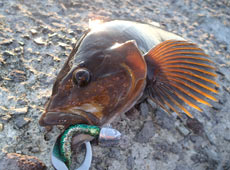 タックルを持ち替えて14gのエコギア・イワシヘッド+エコギア・グラスミノーLで巻くスピードを上げて再度同じ場所を通すと4度目の正直!!45アップの良型アイナメ(アブラコ)がヒット!