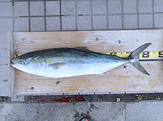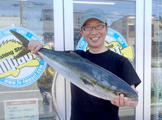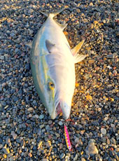 ヒラメを狙い、海峡サーフへでかけてきました。 早朝4:20に岡クラフト・ATラビット23で最初のヒット!かなりの重量感から「良型ヒラメ!!ん?引きがちょっと違う?サクラマス?」などと考えていると、いきなりドラグが鳴りラインを出され青物確定!!左右に走られながら、20分の格闘!!波に乗せてずり上げようとするも3回失敗!!4回目で来た大きな波に助けられ無事ランディング!!腕がパンパンになりました(^_^;) 84cm、約6kgの今季初ブリでした!