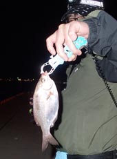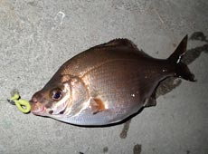その後、船の明かりが海面に落ちている場所でタナゴを発見、遠目にキャストしてスイミングで通すとタナゴがヒット!25cmに迫る良型(*^^*)