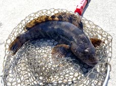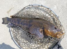 リグは21gフリリグにワームはエコギア・バグアンツ3インチをチョイス。 ショートストロークのリフト&フォールで狙うと1投目でいきなりのバイト! 手応え十分のファイトで上がってきたのは、40アップのアブラコ(アイナメ)!