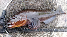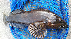 2匹目 ジャングルジム・ビーンズ21g+エコギア熟成アクア・バグアンツ2インチでずる引きしてケーソンのエッジに引っ掛けてバイト!40cmくらいのアブラコ(アイナメ)