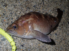 サイズアップを目指して狙いを変えて、沈みブロックの穴打ちをしてみると、丸々と太ったガヤ(エゾメバル)がヒット!エコギア熟成アクア・スーパーどじょうは昼でも夜でも釣れますね〜